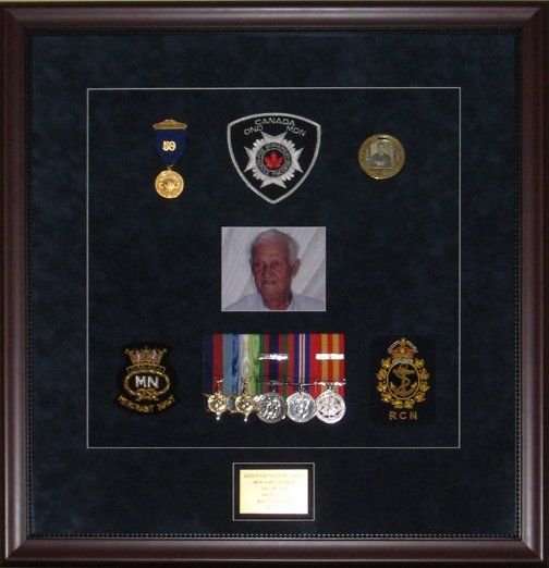 This shadow box was given as a gift from my customer to his wife as a remembrance of her father's career in the military and the DND fire department. Various badges (Merchant Navy, Royal Canadian Navy and the Canadian Department of National Defense Fire Department badge), medals and a photo were some of the items displayed.