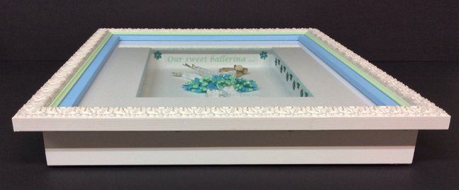 The single white mat was combined with a variegated bevel accent made from 8-ply matboard which was hand-painted using 4 different colours (2 shades of blue and 2 shades of green). The spacer that separates the top mat from the mount board provides the necessary depth for the 3D paper quilling, and also provides a wonderful surprise when viewed at an angle. The text “Our sweet ballerina...” is displayed along the top spacer and “Hailey Grace” is displayed along the bottom. Floral sequins, held in place with French knots, finished off the spacer design.