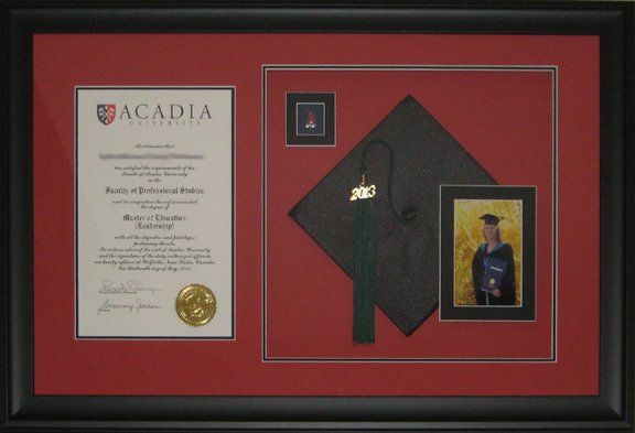 This frame was a graduation gift from the customer to his wife. It features her Master's degree from Acadia University, along with her graduation cap, alumni pin, and a photo from her convocation. The university's colours, garnet and blue were incorporated into the design.