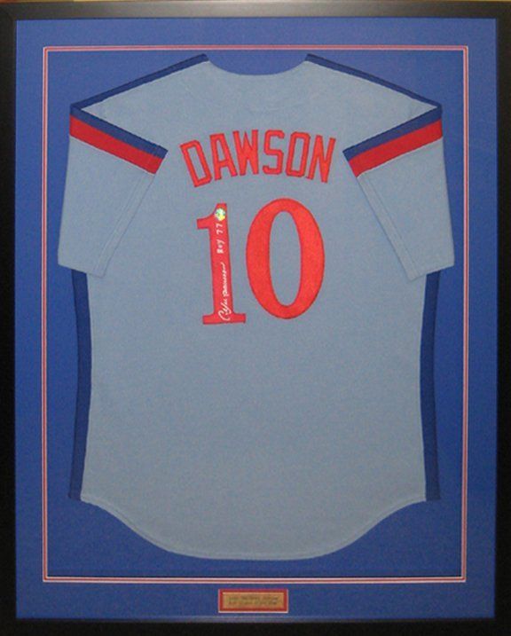 This autographed Andre Dawson baseball jersey (Montreal Expos) was framed in a shadow box. The mat colours were chosen to coordinate with the colour of the jersey. The jersey was mounted using a combination of a 4 ply artcare matboard form insert (to help hold its shape), sewing and nylon tags. Matboard inserts were also placed inside the sleeves in order to help even out the stripes at the top of the sleeves and keep the sleeves flat. Tru Vue Conservation Clear glass (UV protection) was chosen to slow down any fading of the jersey and signature. An engraved brass nameplate with information about Andre Dawson was displayed below the jersey in its own mat opening.