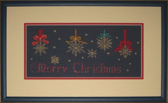 A dark blue moulding from Larson-Juhl ties in with the blue aida cloth background. The double mat colours complement the colour of the snowflakes, ribbons, and the "Merry Christmas" message. Tru Vue's conservation clear glass was chosen for its 99% UV protection.