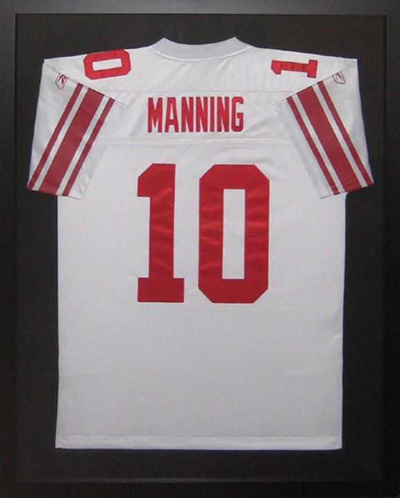 An Eli Manning football jersey (New York Giants) was framed in this shadowbox. The sleeves were folded in order to have the jersey fit within a 32"x40" size frame. Black archival mats were used as the background behind the jersey as well as to line the sides of the shadow box (and hold in the glass). A white archival mat was used as a form inside the body of the jersey to help the jersey hold its shape and a combination of nylon tags and hand-stitching was used to mount the jersey to the backing mat.