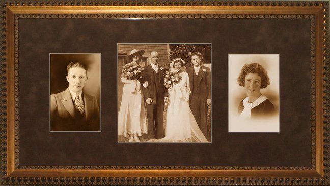 My customer wanted to display the engagement photos of her parents as well as their wedding photo in one frame. Because all three photos were different colours and damaged, the photos were restored and changed to a sepia tone that unified them. An antique style frame as well as a sepia colour suede mat where chosen to reflect the time period in which the photos were taken.
