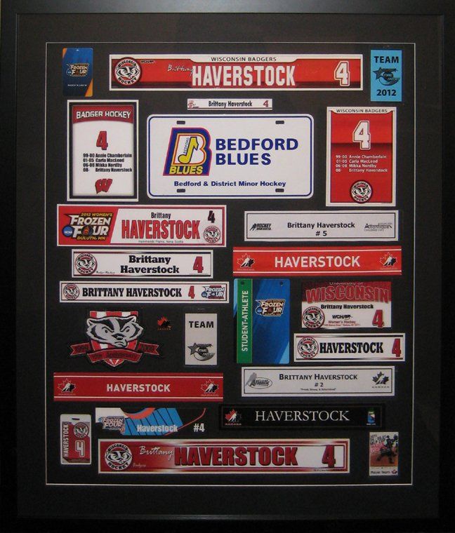 One of the things I love best about framing is that frames often will tell a story. In this particular case, my customer had saved memorabilia from her daughter’s hockey career, which included her time playing on a variety of local, provincial, national and international teams. In all, there were 25 items displayed in this shadow box including nameplates, athlete’s ID cards from tournaments, a badge and pin.