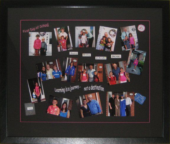 This was an interesting project to work on. My customers wanted to present a frame of school photos to their daughter who was graduating high school. They initially thought of framing the official annual school photos, but mentioned that they had taken a '1st day of school' photo each year. To make a more whimsical and less formal design, it was decided to use the '1st day of school' photos.