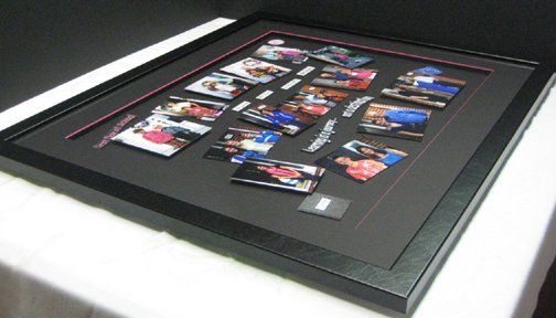 School related stickers and images were interspersed among the photos and the daughter's name was printed on the front of the notebook at the bottom left corner of the design. The daughter's favourite colour was pink, so the bevel of the top mat was hand-painted in a bright pink colour and also used as the font colour for a couple other design images. A black-faux leather moulding was chosen for the frame and Tru-Vue's conservation clear glass, with its 99% UV protection, was used to help keep this 'school days memory' frame looking great for years to come.