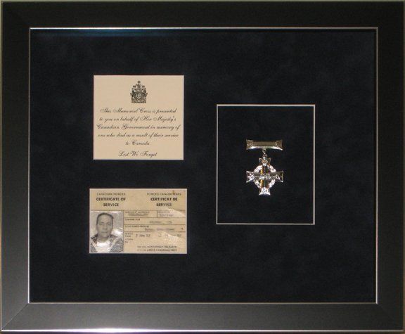 This customer wanted to frame the Memorial Cross (also referred to as the Silver Cross) that she received in memory of her husband's military service. Also included in the shadow box was the information card that came with the medal and her husband's certificate of service card.