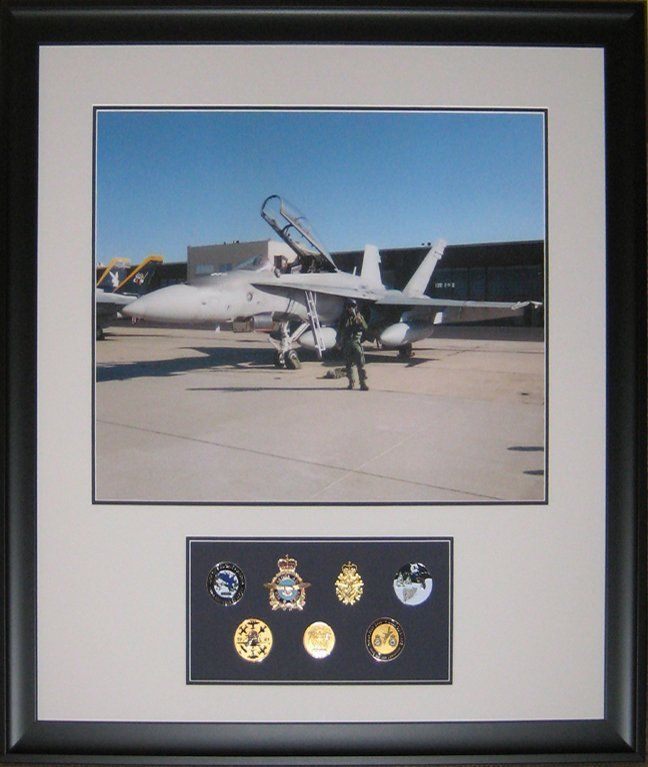 This customer had a photo commemorating his last time flying a CF18 fighter jet and marking his 100th hour flying the jet. Along with the photo, he wanted to display his cap badges and squadron coins.