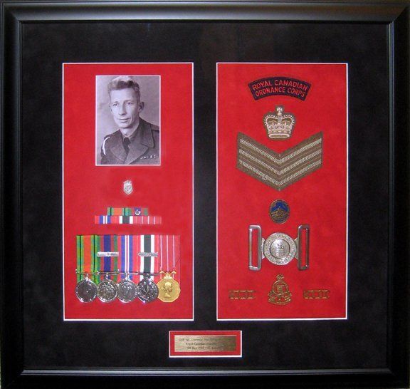 This was the second military shadow box ordered by the customer. This time, he wanted to display the military memorabilia belonging to his father. Since his father was a member of the Royal Canadian Ordnance Corp, the customer chose a red suede mat as the background colour (the colour of the RCOC). Along with a photo of his father, the shadow box included a service pin, ribbon bar, medals, patches, RCOC belt buckle, cap badges and pins. An engraved nameplate was also included.