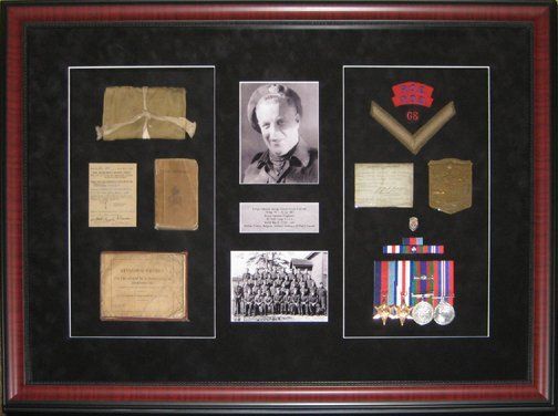 The customer had her father-in-law's military memorabilia framed to give as a birthday gift to her husband. Items included in this shadowbox... medal rack and ribbon bar, badges, service certificates, bible, drivers handbook, photos, etc.
