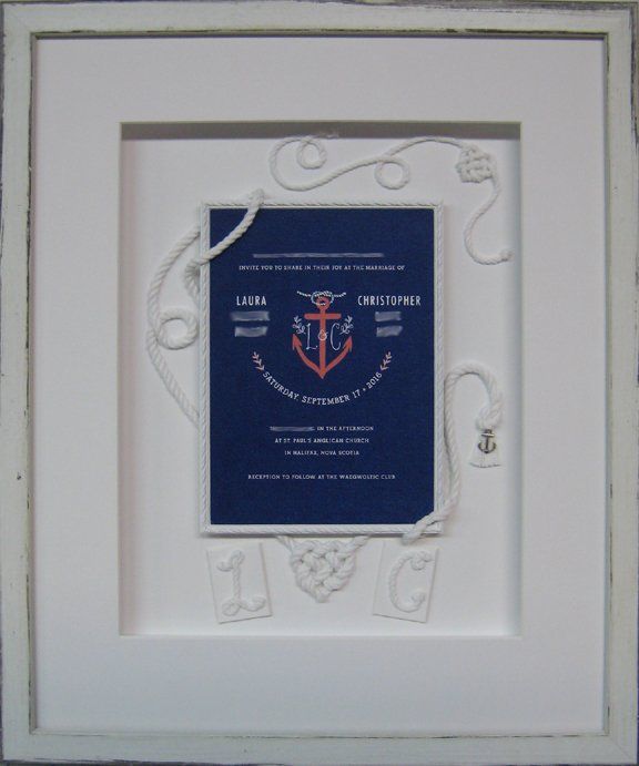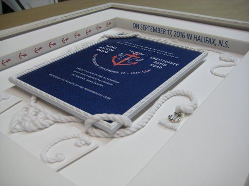 My niece got married in the fall of 2016 and I framed her wedding invitation as a bridal shower gift for her. Her wedding had a nautical theme, so I designed the shadow box around that theme; keeping the majority of the materials white, so that the invitation would be the focal point. I incorporated a rope design (hand-stitched in place), complete with two Celtic rope heart knots and the bride and groom's initials. Youtube is a great resource for learning how to tie Celtic heart knots! As an extra 'surprise' design feature, I added red anchors along the side spacers of the shadow box and, along the top and bottom, I had printed information about the special day. On my niece's 'save the date card', she had the phrase "tying the knot", so I incorporated that into the design. These features are only visible if you look at the frame side-on. A small anchor charm was a nice addition to help keep the rope tassel in place. I made the mini frame for the invitation from a black rope fillet (from Fotiou Frames) which I had painted white.