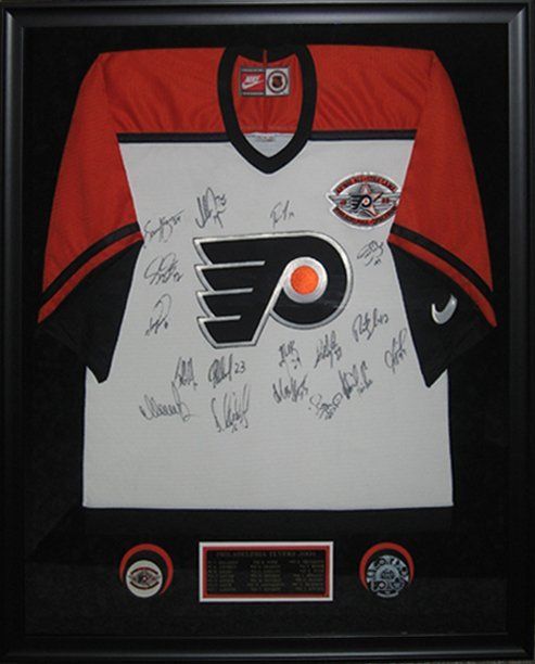 This autographed, Philadelphia Flyers All-Star game hockey jersey was showcased along with two team hockey pucks and an engraved nameplate. The nameplate and hockey pucks were positioned underneath the jersey, so in order for these black coloured items to stand out against the black suede background mat, pieces of contrasting coloured matboard (orange and white) were first attached to the suede mat (hand-sewn in place) and then the items were attached to those matboards. The orange matboard was actually hand-painted in order to have an orange colour which matched the orange in the jersey.