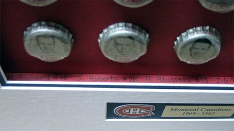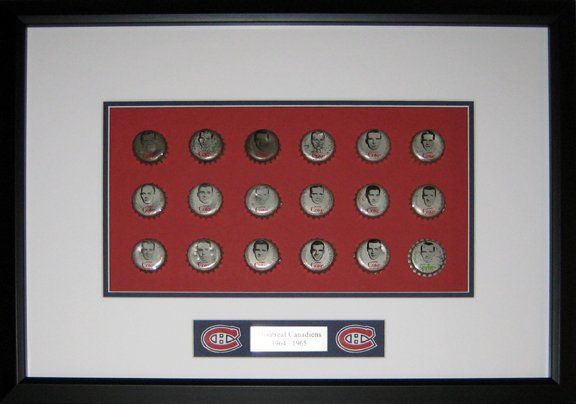 My customer had collected a set of 18 vintage Coke/Sprite bottle caps with the images of the Montreal Canadiens hockey team from 1964-1965. Mounting one bottle cap, let alone 18, was a first for me!