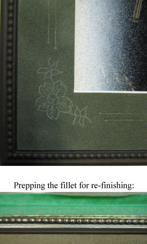 Two mouldings from Larson-Juhl’s Brighton collection were stacked together to create a shadow box with enough depth to accommodate the dress. The face frame had a beaded detail at the lip which gave the frame a vintage look. My customer wanted to highlight the lace details in the dress so a soft green suede mat from Crescent Matboard’s Moorman suede collection was chosen. Tru Vue’s conservation clear glass provided 99% UV protection which will help keep this family heirloom looking its best for years to come.