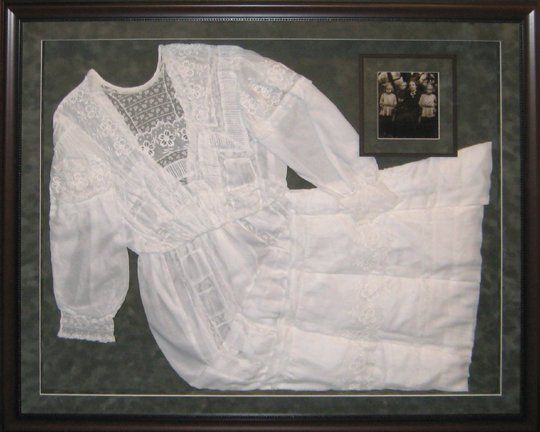 This recent framing project was a first for me in my 21+ years of framing. My customer had a treasured family heirloom that she wanted framed… her great-grandmother’s wedding dress, which was hand-sewn by her great-grandmother 110 years ago! The dress was also worn by her mother when she got married in the 1970s. In addition to the dress, my customer had a photo of her great-grandmother and her children when they were small. Her grandmother was one of the identical twins in the photo.