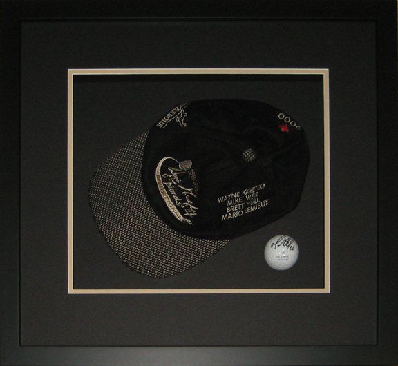 One of the things I love most about being a framer is hearing the interesting stories behind the items being framed and knowing that you are framing memories. For example, the golf cap and ball... Back in 2000 when the recipient was a young boy, he attended a Wayne Gretzky celebrity golf tournament. He was hit in the foot by one of Mario Lemieux’s golf balls and was given a golf ball autographed by the famous hockey player. He also had a commemorative cap from the tournament, which he wore for many years.