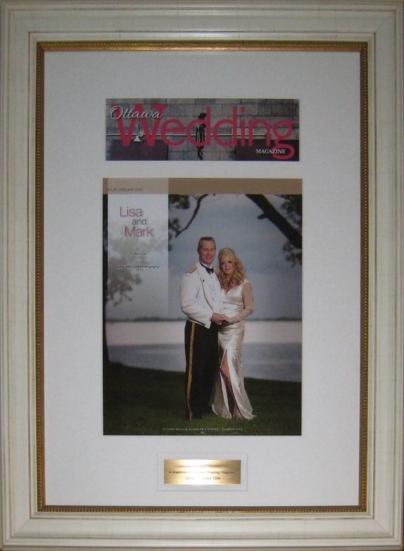 One of my best long-time customers was remarried and the marriage ceremony was featured as a seven page article in the spring 2016 issue of a wedding magazine. As a birthday gift for his bride and a memento of their wedding, my customer wanted to frame their article. The full-size title page of the article, along with the name of the wedding magazine, and an engraved nameplate were showcased in one frame. The other frame displayed the remaining six pages of the article, which were reduced in size from a .pdf version of the article.