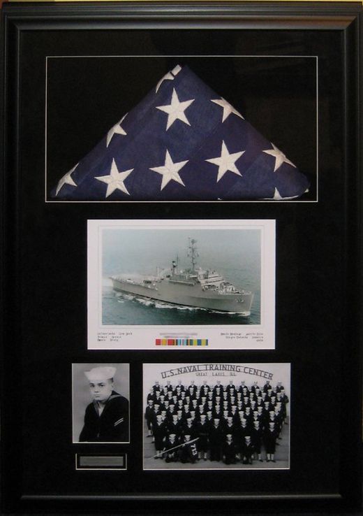 A framing project that I worked on for Christmas 2015... My customer brought me some military memorabilia belonging to his wife’s grandfather that he wanted to have framed for her for Christmas. He had three photos... a portrait, a class photo and a photo of the ship on which her grandfather sailed. Along with the photos was a folded American flag.