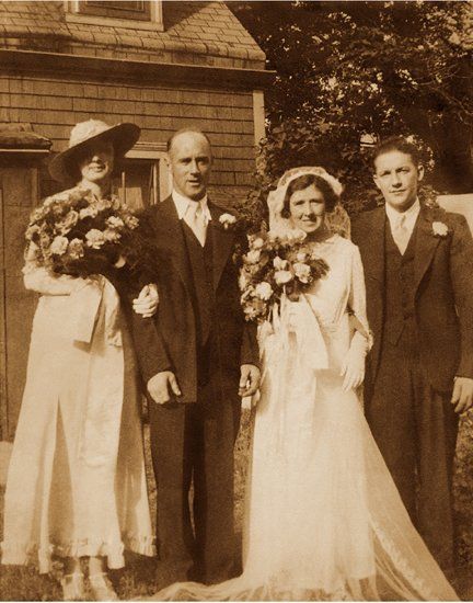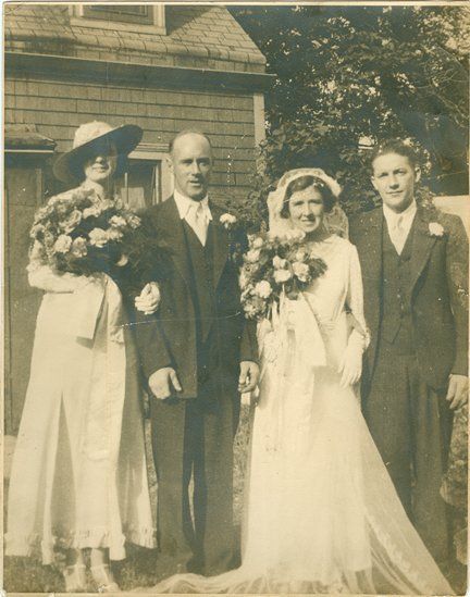 My customer wanted to display the engagement photos of her parents as well as their wedding photo in one frame. Because all three photos were different colours and damaged, the photos were restored and changed to a sepia tone that unified them. An antique style frame as well as a sepia colour suede mat where chosen to reflect the time period in which the photos were taken.