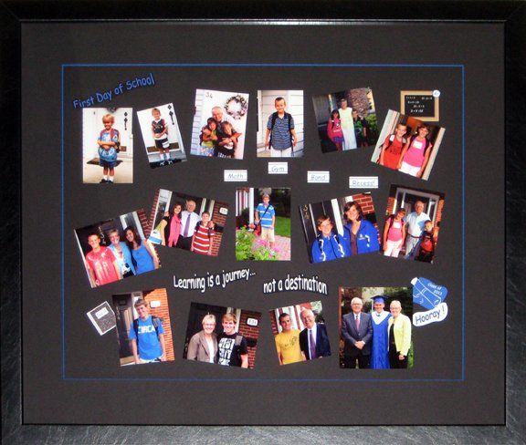 This was an interesting project to work on. My customers wanted to present a frame of school photos to their daughter who was graduating high school. They initially thought of framing the official annual school photos, but mentioned that they had taken a '1st day of school' photo each year. To make a more whimsical and less formal design, it was decided to use the '1st day of school' photos.