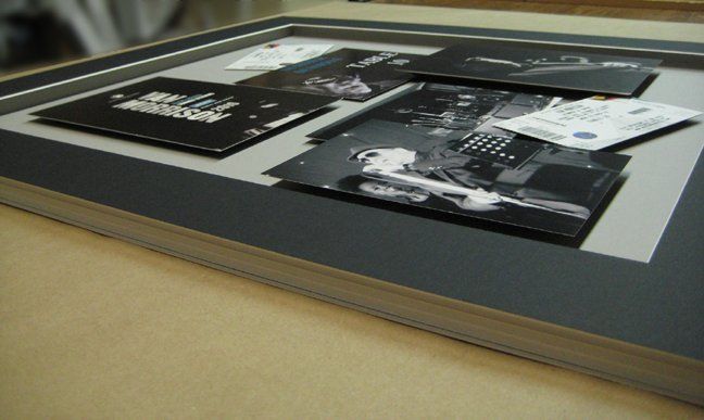 Each piece of memorabilia was floated-mounted on the background mat with varying levels of height to give it a 3-D effect and add more interest to the design. A classic black frame from Larson-Juhl’s Alto collection was chosen for the frame and the mats were from Peterboro Matboards’ conservation line. Tru Vue’s Ultra Vue glass was chosen for its amazing clarity.