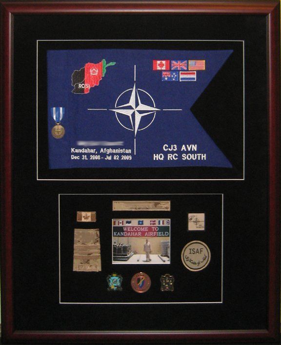 My customer wanted to display some military memorabilia he brought back from his NATO tour of duty in Kandahar, Afghanistan. Items included a personalized pennant, NATO medal, medallions, patches and a photo of himself on his last day of his tour of duty.