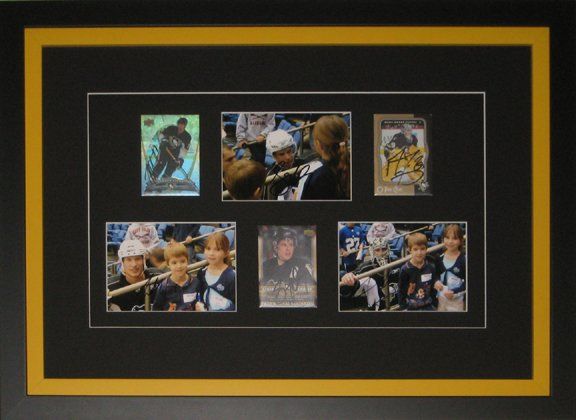 My customer had three autographed player hockey cards... Sidney Crosby, Marc-Andre Fleury and Jordan Staal. He also had three autographed photos of his children with these three players.