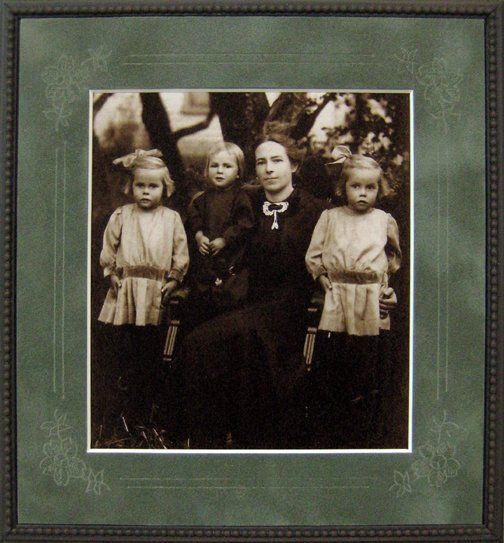 This recent framing project was a first for me in my 21+ years of framing. My customer had a treasured family heirloom that she wanted framed… her great-grandmother’s wedding dress, which was hand-sewn by her great-grandmother 110 years ago! The dress was also worn by her mother when she got married in the 1970s. In addition to the dress, my customer had a photo of her great-grandmother and her children when they were small. Her grandmother was one of the identical twins in the photo.