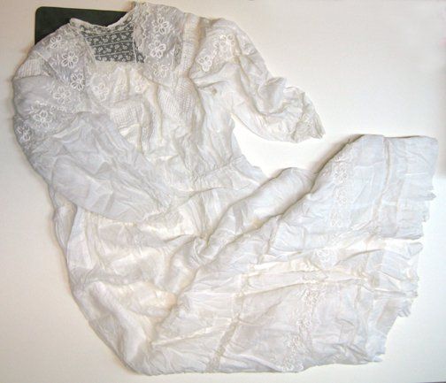 The cotton wedding dress had been stored in a box in my customer’s cedar chest and other than being quite wrinkled when taken out of the box, the dress was in very good shape. There were a few yellow stains, but they were hidden when folding the dress for placement in the shadow box. With my twin sister’s help, I pressed the dress and was able to remove much of the wrinkling (this took almost 4 hours!). The dress had a lot of lace and fine pleating details – simply gorgeous!
